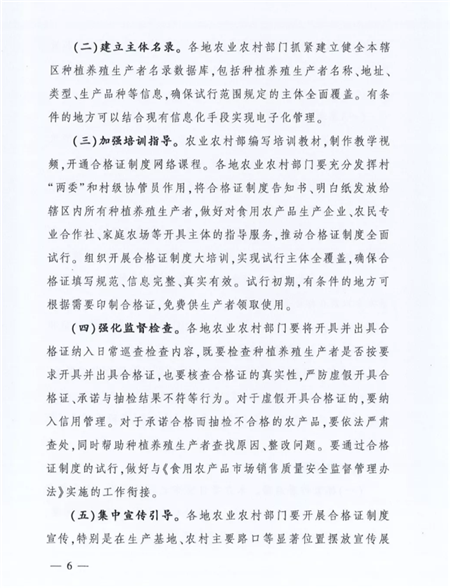 推行農(nóng)產(chǎn)品合格證既是落實(shí)生產(chǎn)經(jīng)營主體責(zé)任的迫切需要,也是構(gòu)建農(nóng)產(chǎn)品質(zhì)量*長效監(jiān)管機(jī)制的現(xiàn)實(shí)需求,更是落實(shí)《農(nóng)產(chǎn)品質(zhì)量*法》的必然選擇,對于促進(jìn)農(nóng)業(yè)產(chǎn)業(yè)健康發(fā)展、確保農(nóng)產(chǎn)品消費(fèi)*、保證人們的身體健康*具有重大的意義。