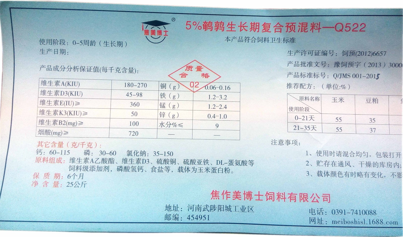 美博士Q522鵪鶉生長期5%預混料,進口的酶制劑等微生態(tài)制劑的使用大大降低了對幼小器官的損傷,大大提高鵪鶉消化吸收利用率。高含量的維生素A、維生素D、維生素E、維生素K、維生素C、維生素B1、維生素B2、維生素PP、維生素B12、維生素B4和其他維生素等。專用生長期料中包括松針粉、槐葉粉、紅豆草粉、三葉草粉和野菊花粉等提取物添加,從而使鵪鶉健康快速的生長,高含量的鵪鶉專用維生素和*微量元素的應用使得應用使得鵪鶉機體免疫力大大加強,大大提高鵪鶉成活率以及幼雛質(zhì)量,為鵪鶉高產(chǎn)蛋打下良好的基礎(chǔ)。
